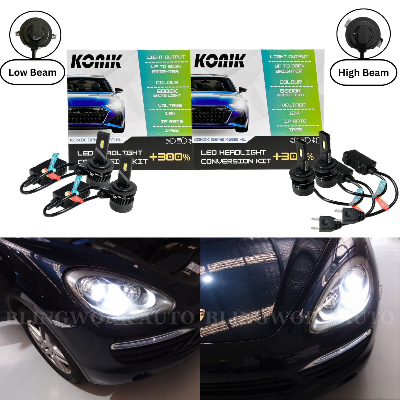 KONIK H7 K300 LED LOW + High BEAM CONVERSION KIT FOR 2010+ PORSCHE CAYENNE 92A (PRE-FACELIFT)